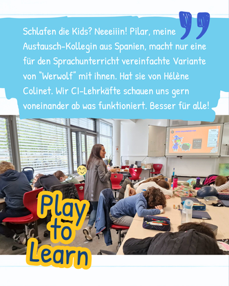 aber nur mit einer Person, die die anderen"umbringt/verhext/in Stein verwandelt". Das wichtigste ist, dass du als Lehrkraft ganz viel einfaches und verständliches English sprichst.